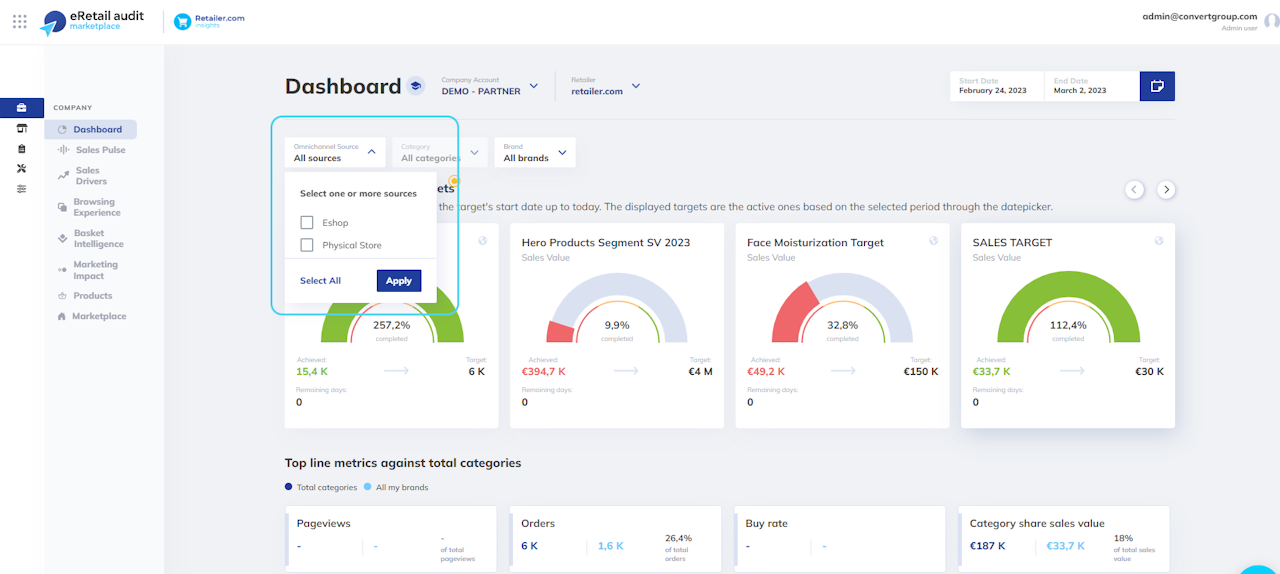 In default views of accounts with multiple omnichannel sources, certain metrics like pageviews, buy rate, and marketing channels are unavailable (they only refer to the eshop source).