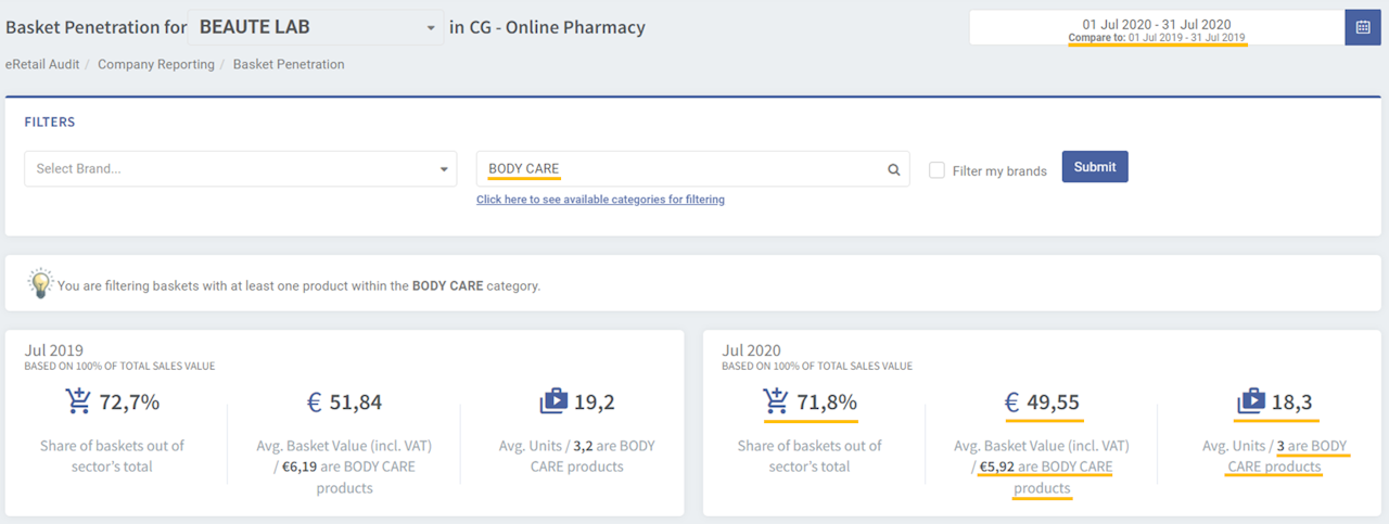 Avg. basket value and units: Check out easily the average value and number of units included in a basket with products of the selected category