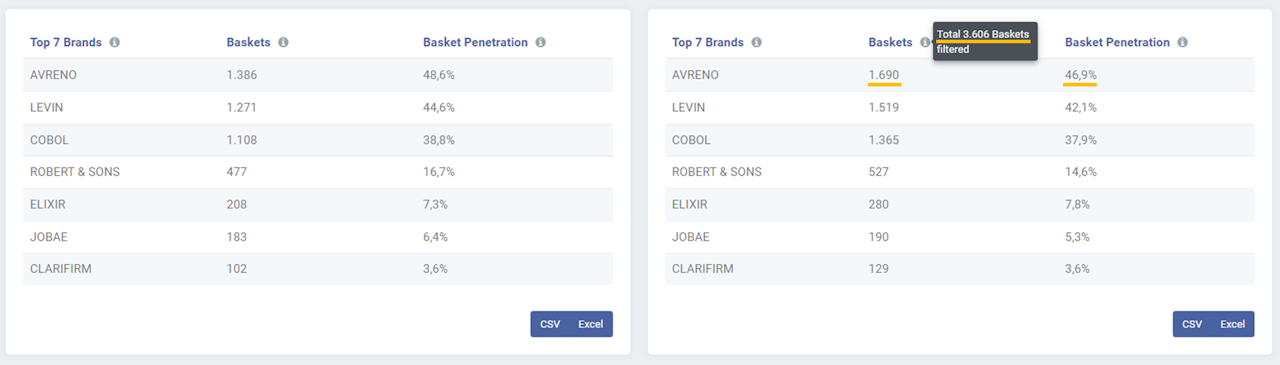By filtering with one of your brands or clicking on the button ‘Filter my brands’, you can check the Basket Penetration of the competitive Brands in the baskets including at least one of your products.