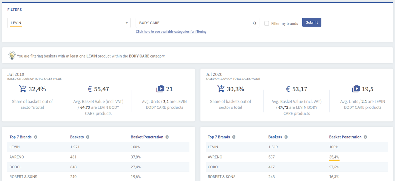 E.g. Out of the total baskets including at least one Levin - Body Care product, 35,4% are Avreno - Body Care products