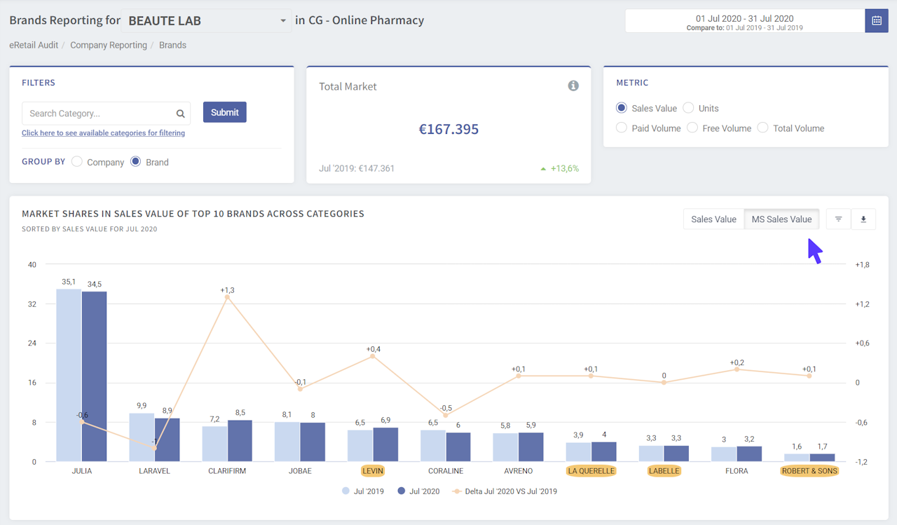 Brands page is a core analytics pages where you can find Sell-out data, Growth rate% and Market Shares of the Top 10 Brands performance of any category level.