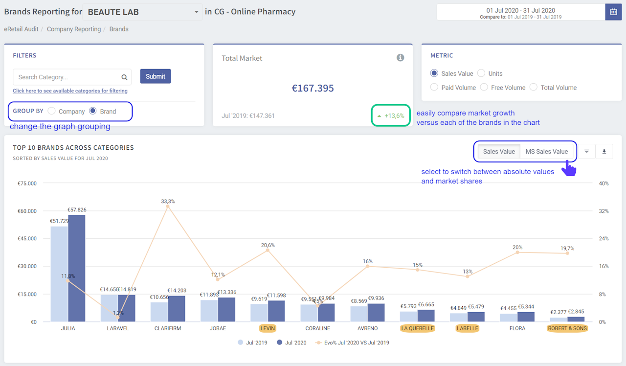 ➡️ Compare each brand’s growth with the category’s growth in the box right above.
