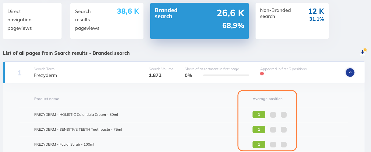 Display of Average Position Ranking: Now shows 3 different colours depending on the ranking of each product. Green means it's in the top 5 positions, Orange means the product is between rank 6-10 and Red shows products that rank in position 11+.
