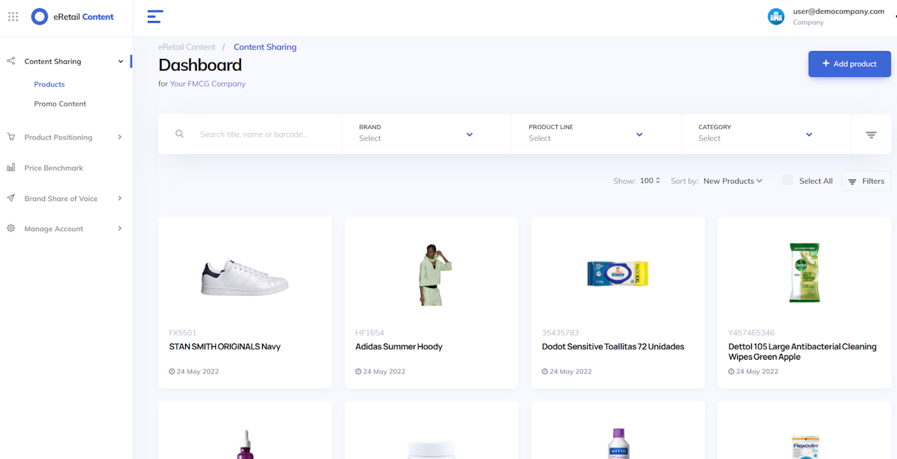 Content Sharing simulates a branded e-shop that you can use to create a single source of truth for your product information and assets.