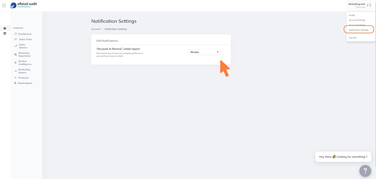 To change the frequency of the automated review report, navigate to Account > Notification Settings. Under the "Account in Review" notification, select your preferred frequency from the dropdown menu: Weekly, Monthly, or None (to deactivate the email).
