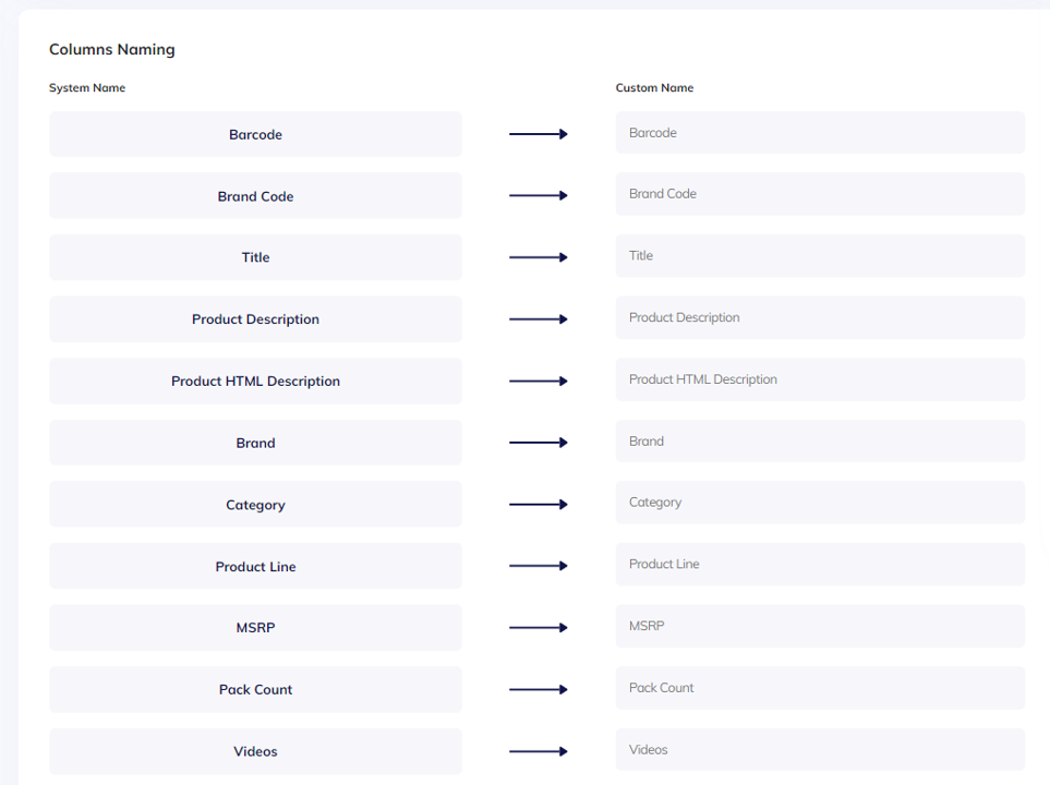 Additionally, a Columns Naming option is possible, allowing you to change the name of the fields in the product description. e.g. Barcode could be renamed to EAN or any other preferred name. And click Create Export.