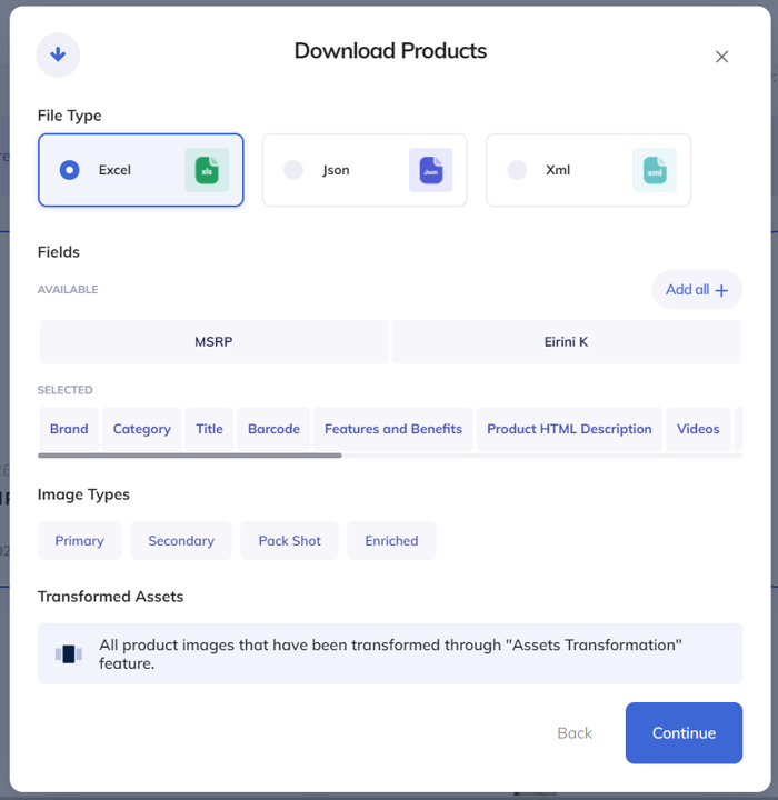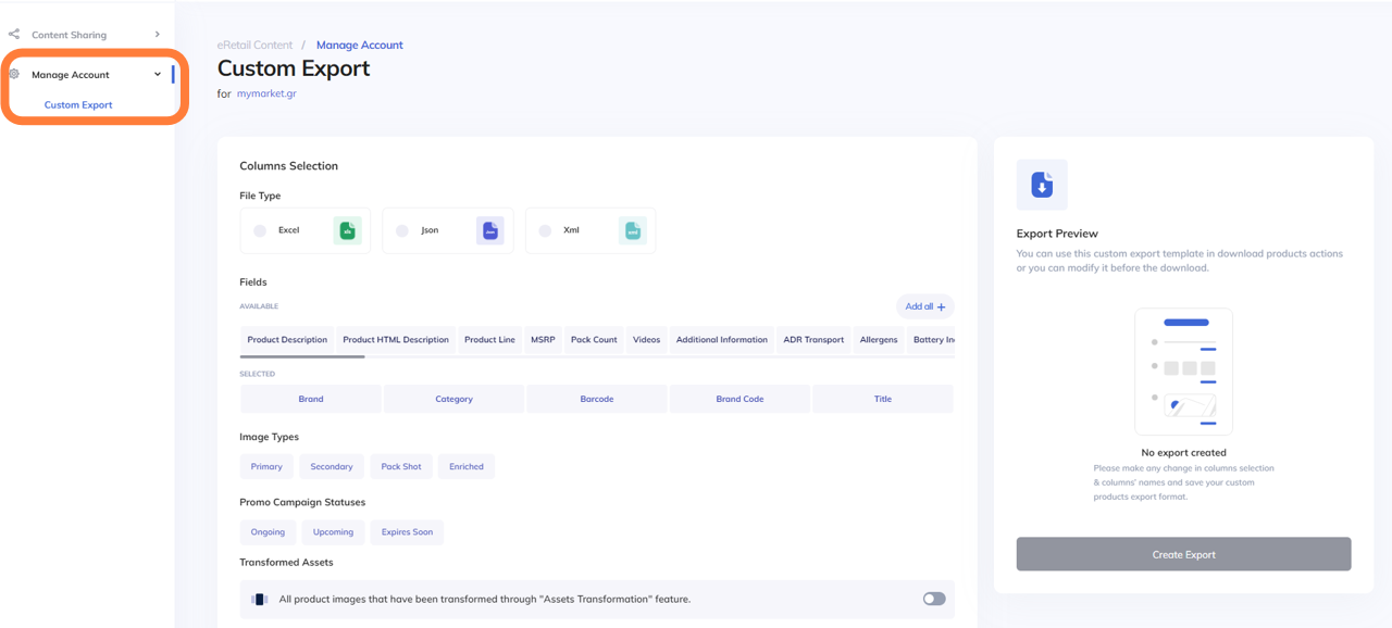 You get 3 options to select by default, content, image types, and transformed assets, but you can also add promo material.