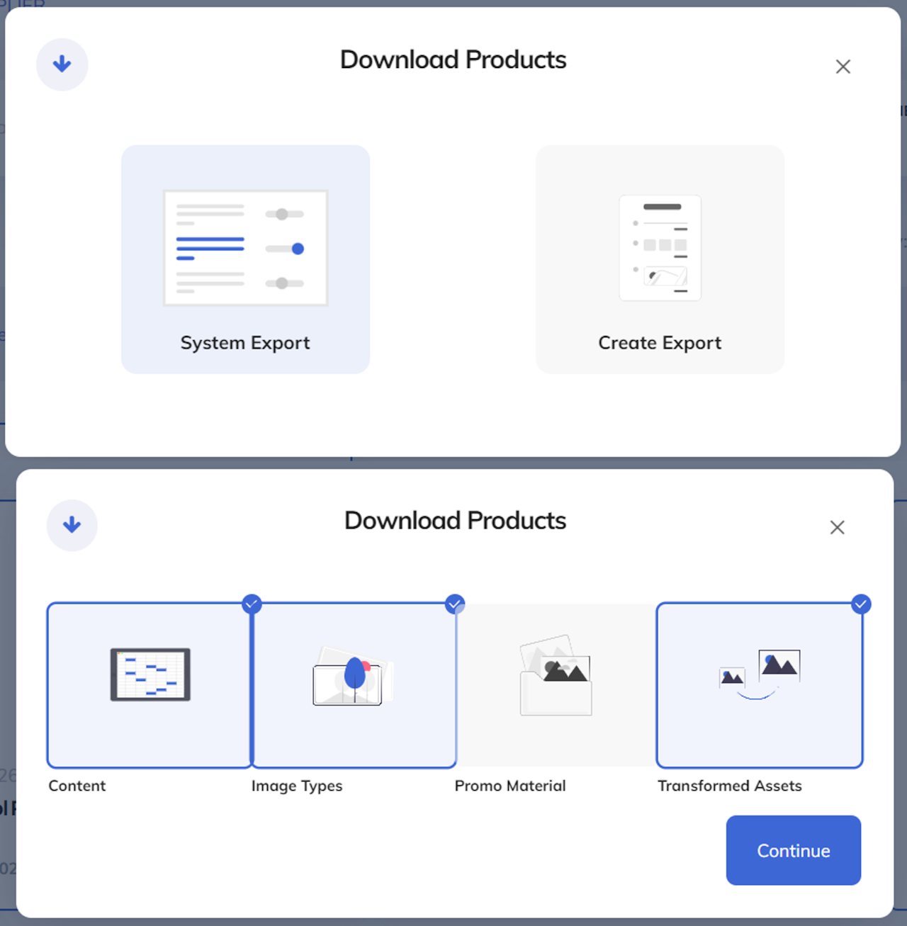 You click the arrow on the right and a pop-up window opens for downloading products as system export or by creating a custom export.