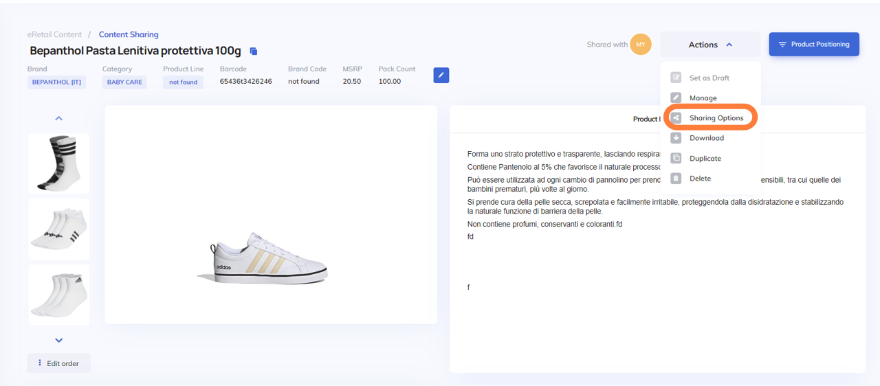3. By sharing a single product when entering the product page, through the Actions menu and Sharing Options. You can easily select Retailers you want content to be shared, and an email will be automatically be sent. Please see an example.