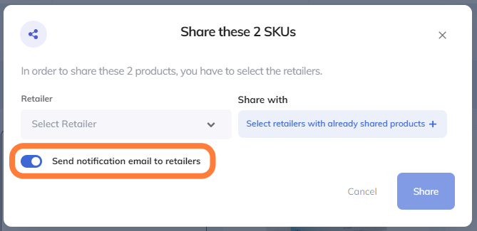 2. By sharing products' content with already registered Retailers. This is done by selecting the products of interest, and clicking the share button, where a pop-up window opens up and Retailers can be selected. Just don’t forget to activate the "Send notification email" to Retailers, before clicking share. Then the Retailer receives an email notification, with the 1st batch of products shared, and if the notification button keeps being activated, for every new product shared, an email will be also sent to the Retailer.