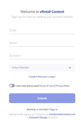 If you want a user to be added to the eRetail Content platform please use the following link https://app.eretailcontent.com/sign-up and fill in the fields requested to sign-up.