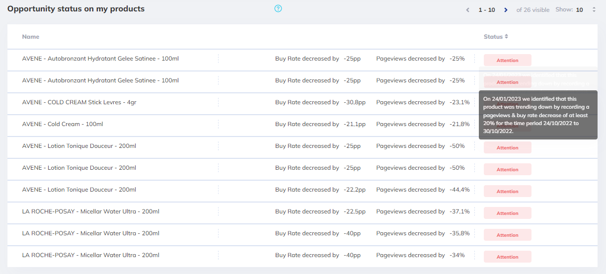 Products are assigned an "Opportunity" or "Attention" status based on whether their pageviews and buy-rate are rising or declining.