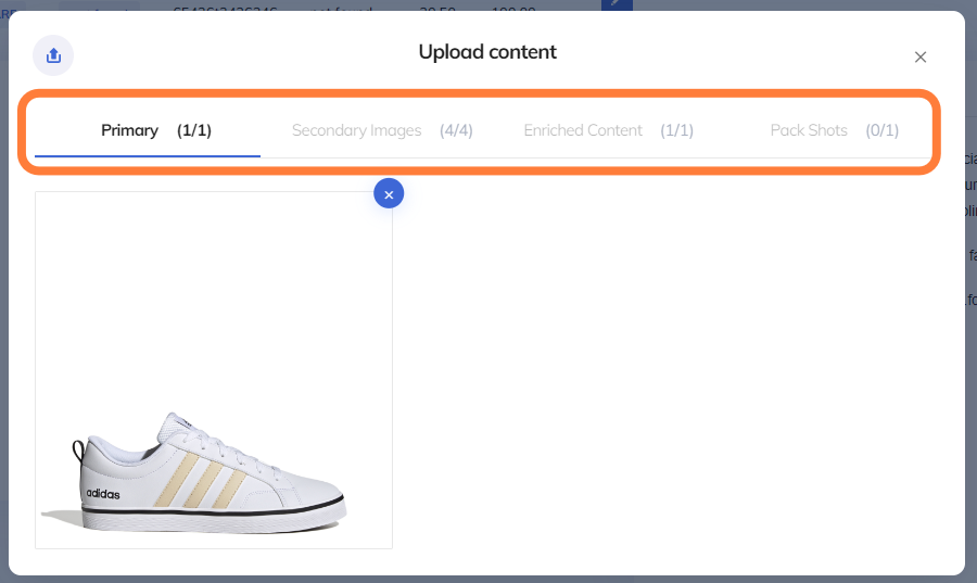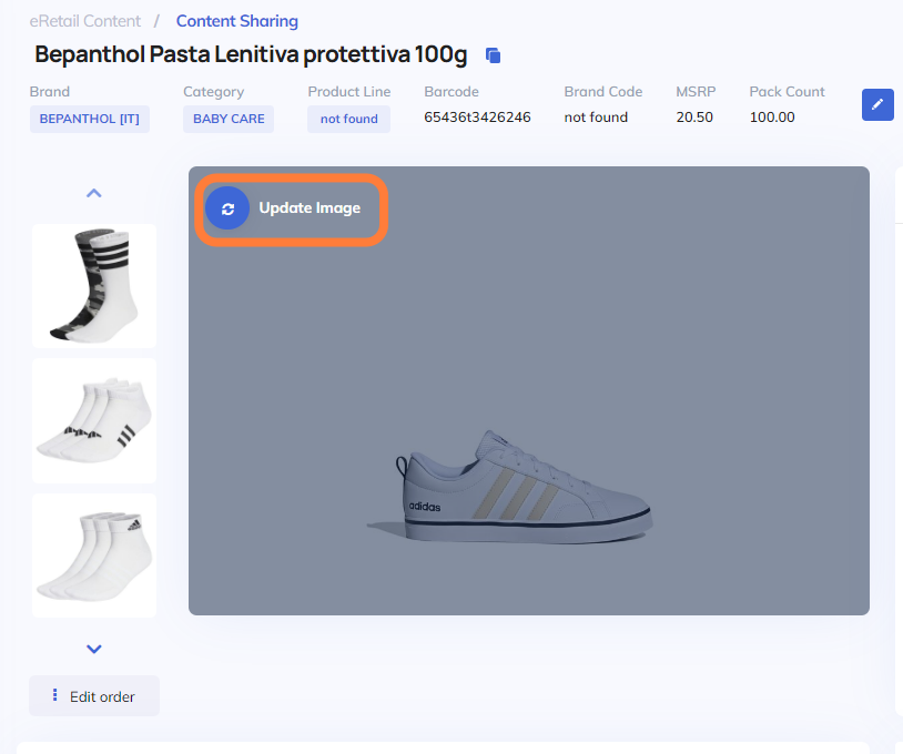 From the products menu in content sharing, you either add a product from the scratch or click on an existing product and enter in the product photo section through the blue button on the left in order to update images.