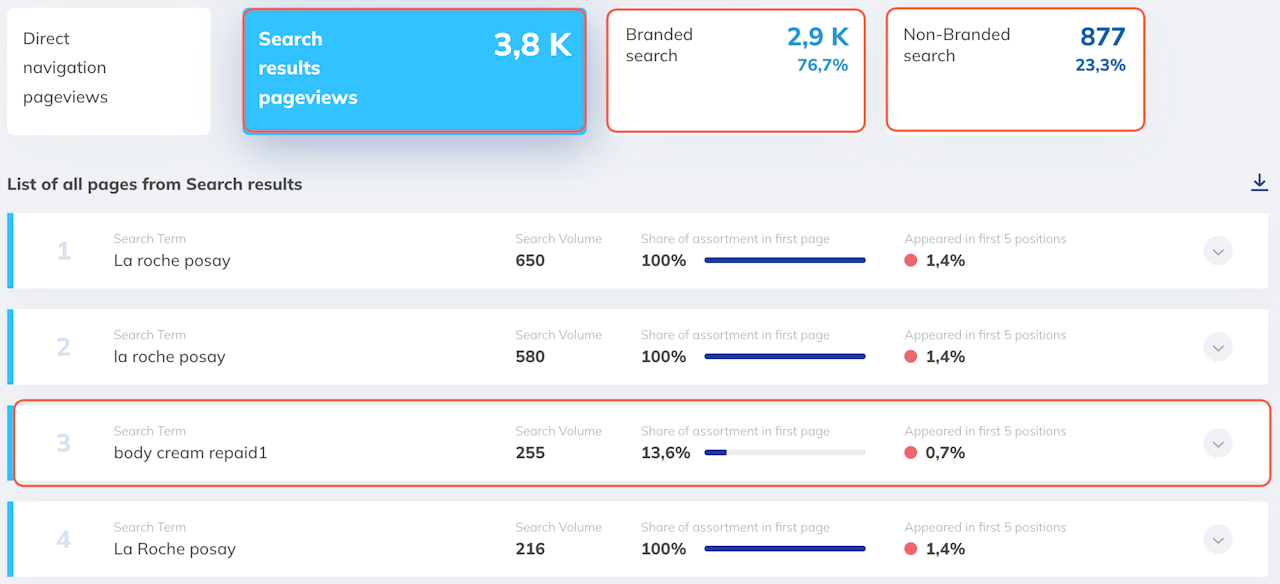 With overall, branded and non-branded keyword trends you can better understand how users find your products in the retailer but also, how well you rank in those keywords.