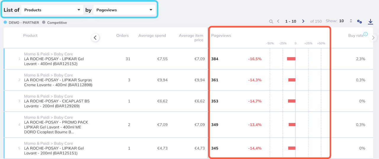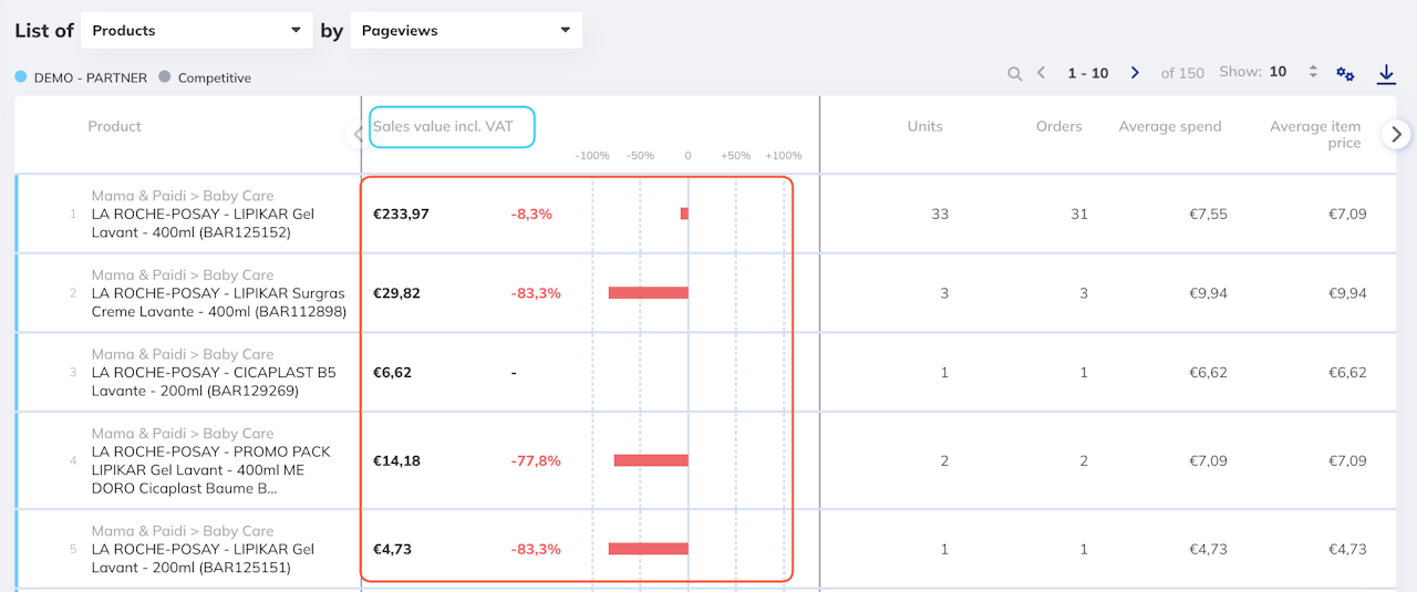 You can click and expand any column to view the decline or uplift % of any product compared to the previous period.
