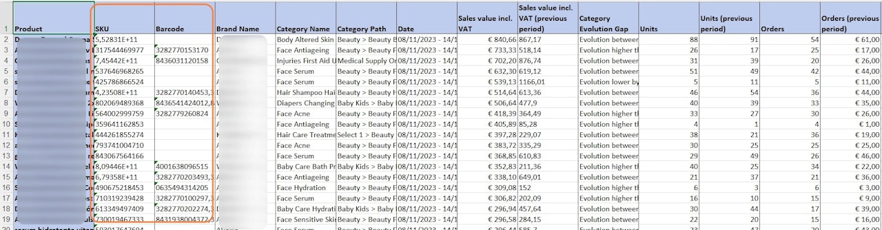 Open the exported file to discover the newly added columns containing all product codes available.