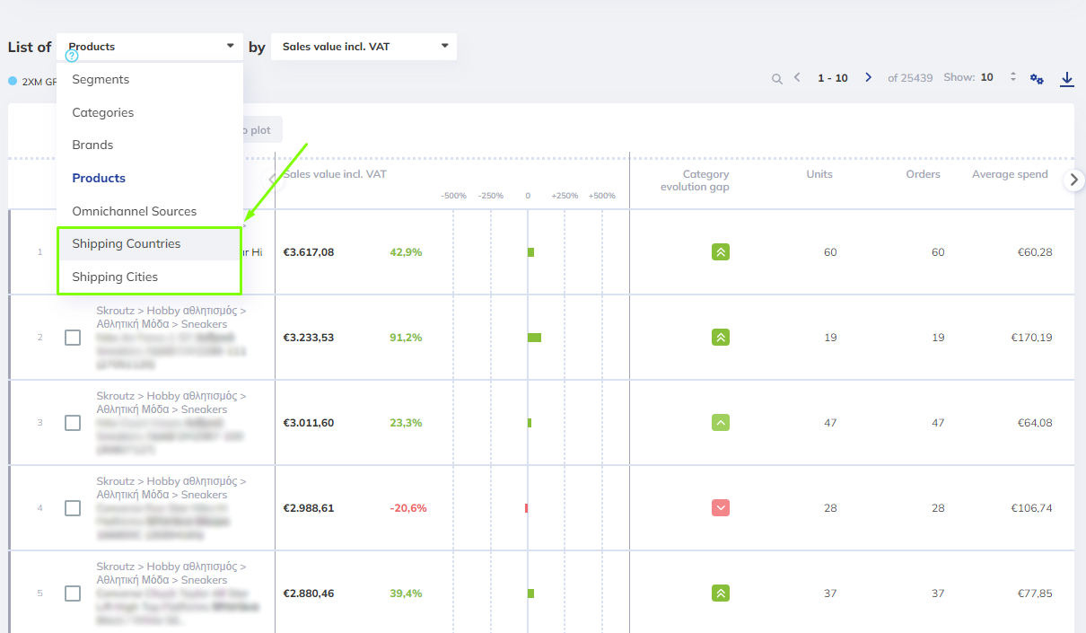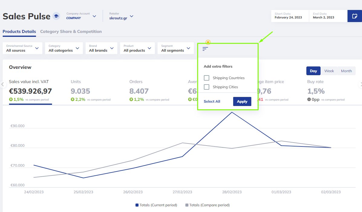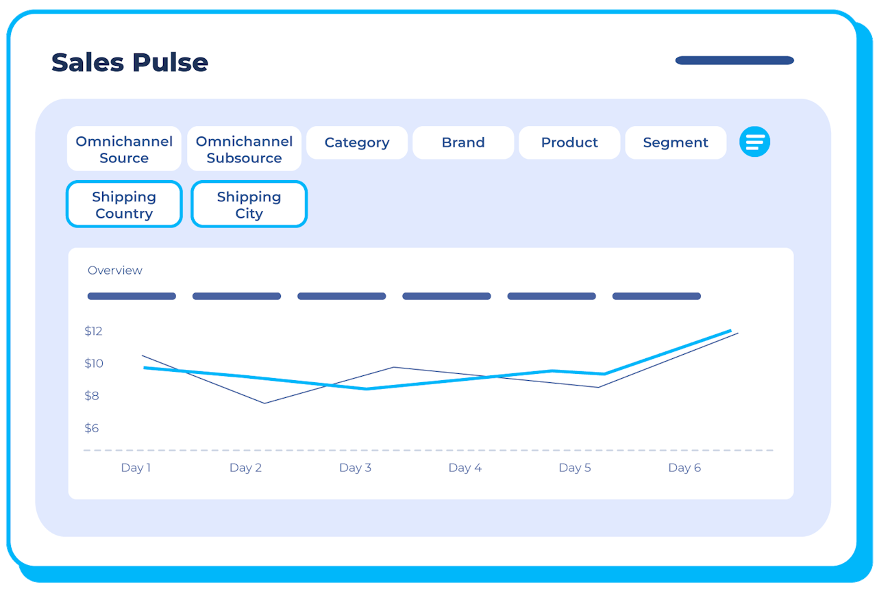Advanced Filtering: Use the new shipping geolocation as an additional filtering option. This multi-select feature allows you to choose multiple dimensions (e.g., country X, city Y) to expand your analysis.